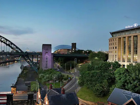 Bottle Bank, Gateshead, NE8 2AROverlooking the iconic Tyne Bridge, Hilton hotel offers convenient and contemporary accommodation complete with breath-taking riverside views. Located on the banks of the Tyne you can experience the best of both Newcastle and Gateshead, with an endless list of activities and entertainment to fill your itinerary. The Quayside, lined with nightlife hot spots, restaurants, markets and art exhibitions, is just a short drive away. Utilita Arena and St. James’ Park is also within close reach as well as a multitude of shops, cafes, bars and tourist attractions in the city centre.